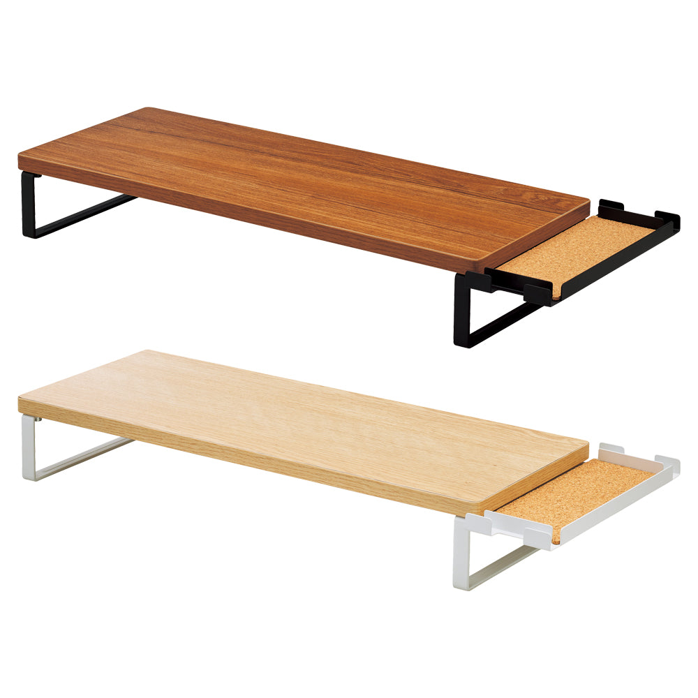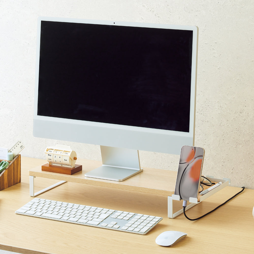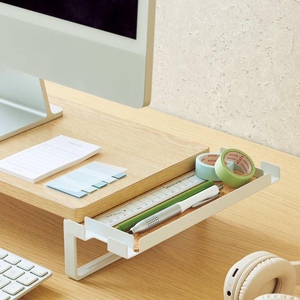 机上台にサイドトレーが付いているので、文具小物や電源タップなどを置くことができて、デスクスペースを有効活用できます。
