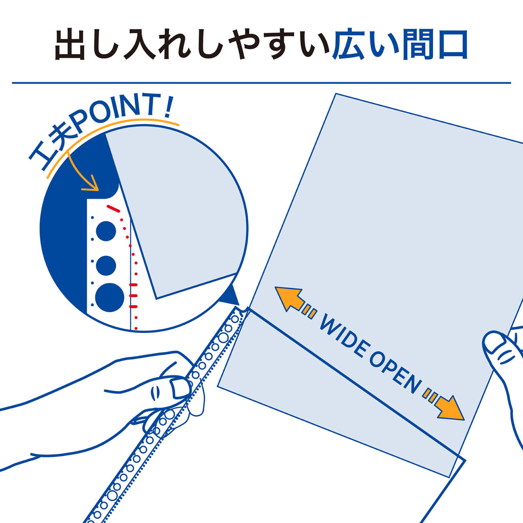 A4・30穴、生地厚0.15mmのトップインタイプのクリヤーポケットです。開口部が広く、用紙の出し入れがスムーズに行えます。通常のクリヤーポケットの2.5倍の厚さで耐久性に優れ、大事な書類の収納に最適です。とじ穴部はテープで補強されているので、丈夫でいたみにくく、長期間ご使用いただけます。