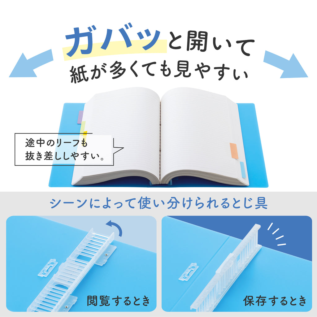 とじ具に付いている2か所のロックを外すと、とじ具が倒れる仕様で、とじた後のリーフも見開きで閲覧しやすいです。
