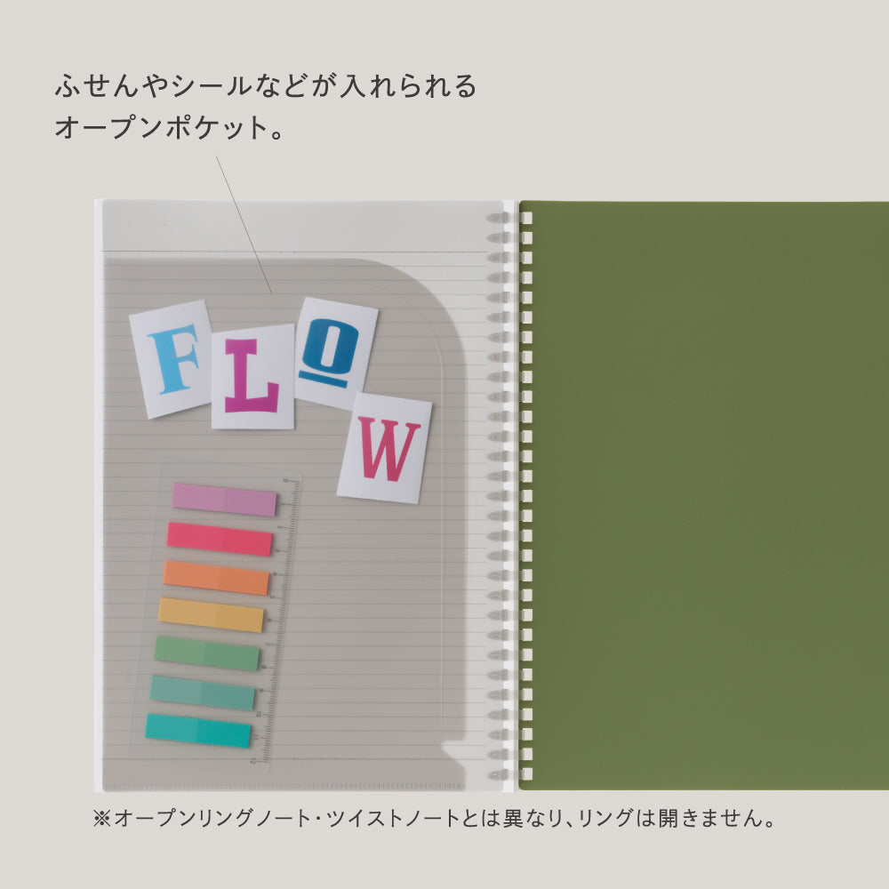 リングと一体になったオープンポケット付きで、ふせんやシール、カードなどを入れて一緒に持ち運びができます。