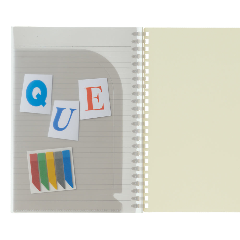 リングと一体になったオープンポケット付きで、ふせんやシール、カードなどを入れて一緒に持ち運びができます。