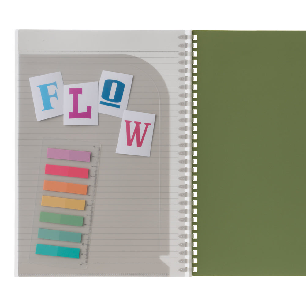 リングと一体になったオープンポケット付きで、ふせんやシール、カードなどを入れて一緒に持ち運びができます。