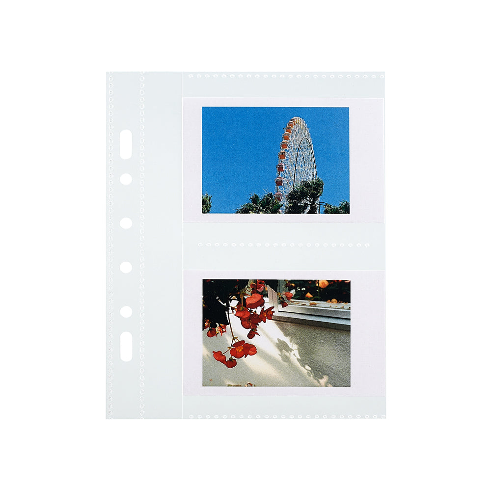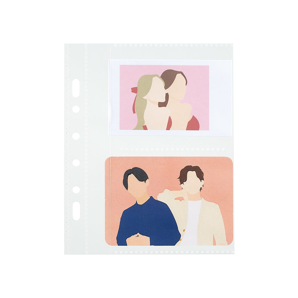 トップインタイプ。スリーブに入れたトレーディングカードやチェキが入る。※「チェキ」は富士フイルム株式会社の登録商標です。コレクションファイル ミニ(F-3320・F-3321)やmyfaシリーズバインダー(N-3320、N-3390、N-3391)などのミニ6穴バインダーに収納可能。