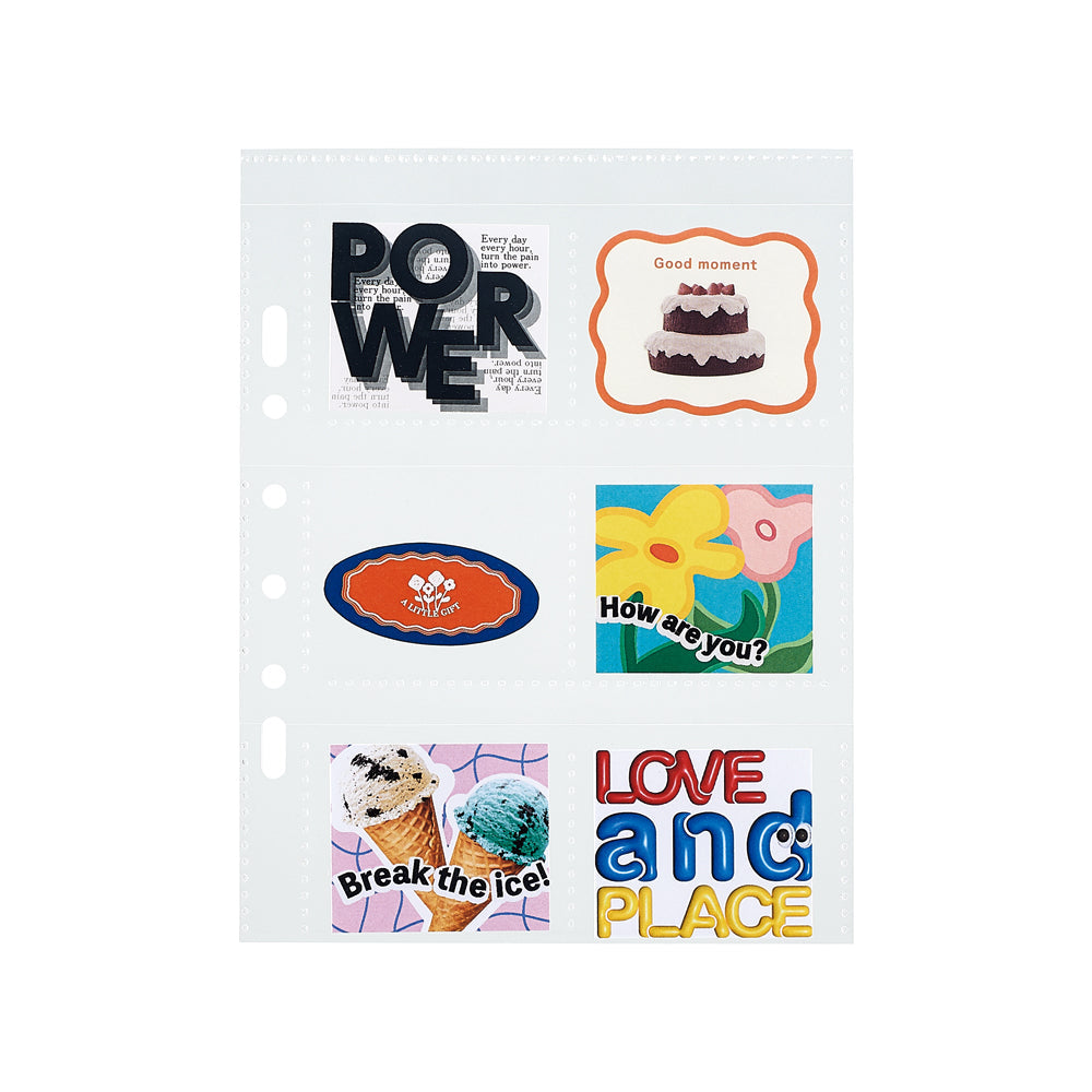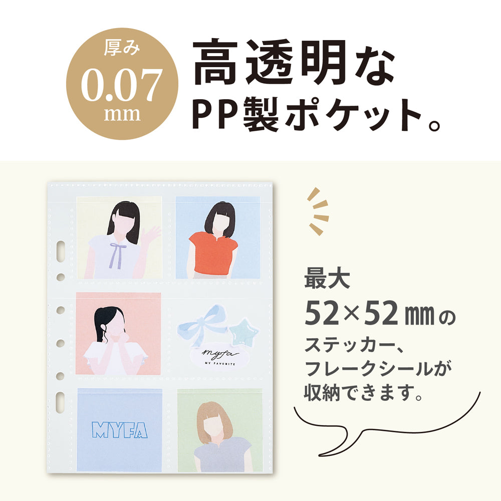 トップインタイプ。ステッカーやフレークシールが入る。コレクションファイル ミニ(F-3320・F-3321)やmyfaシリーズバインダー(N-3320、N-3390、N-3391)などのミニ6穴バインダーに収納可能。