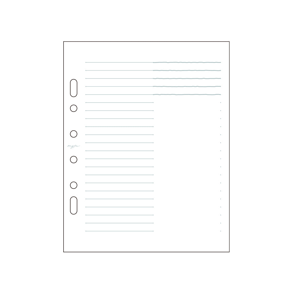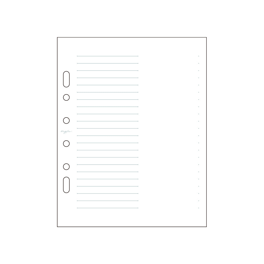 2穴・ミニ6穴に対応した厚口上質紙で書きやすいライフログリフィルです。セットリストや箇条書きに適したハーフサイズの罫線リフィルです。罫線レススペースにはシールや写真を貼ってもすっきり見えます。リフィル右端にあるドットとハーフ罫線を繋げば罫線を延長することができます。別売りの罫線ペン(PN-100)で罫線を書き足してアレンジすることができます。コレクションファイル ミニ(F-3320・F-3321)やmyfaシリーズバインダー(N-3320、N-3390、N-3391)などのミニ6穴バインダーに収納可能。