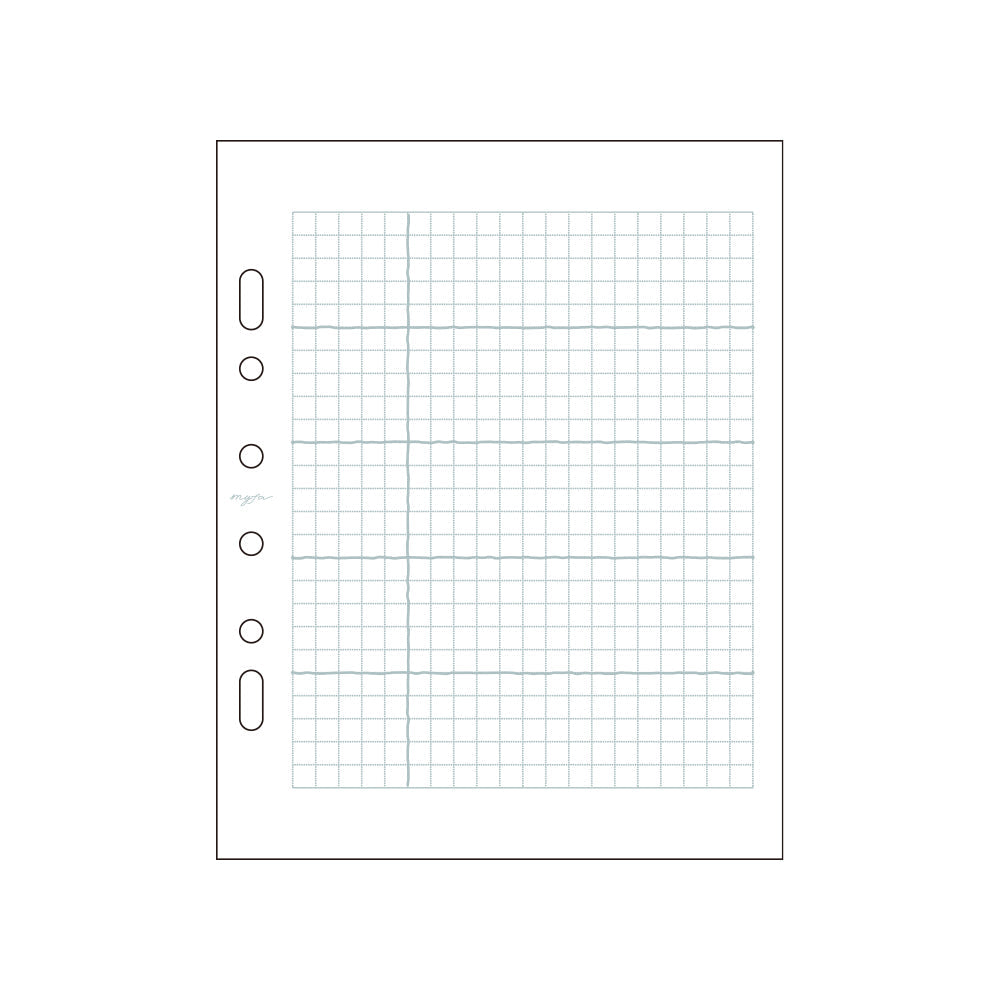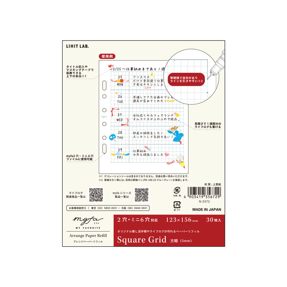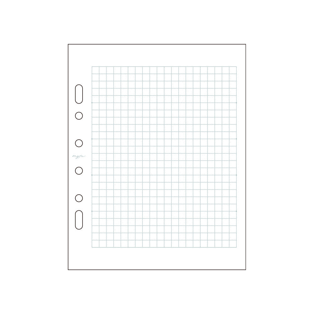 2穴・ミニ6穴に対応した厚口上質紙で書きやすいライフログリフィルです。バレットジャーナルとしても使いやすい枠付き方眼リフィルです。グラフや図形、見取り図、表なども描きやすく、ライブやイベントの座席・マップの作成にも最適です。別売りの罫線ペン(PN-100)で罫線を書き足してアレンジすることができます。コレクションファイル ミニ(F-3320・F-3321)やmyfaシリーズバインダー(N-3320、N-3390、N-3391)などのミニ6穴バインダーに収納可能。
