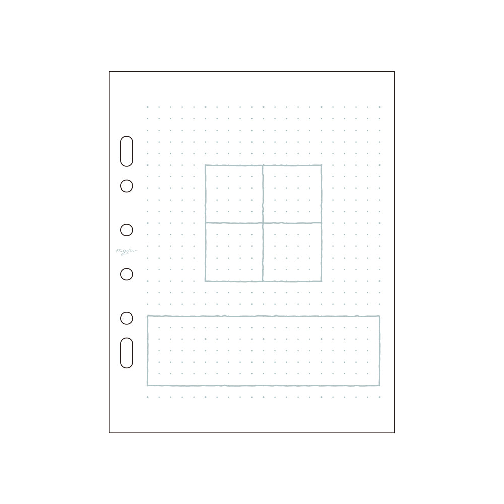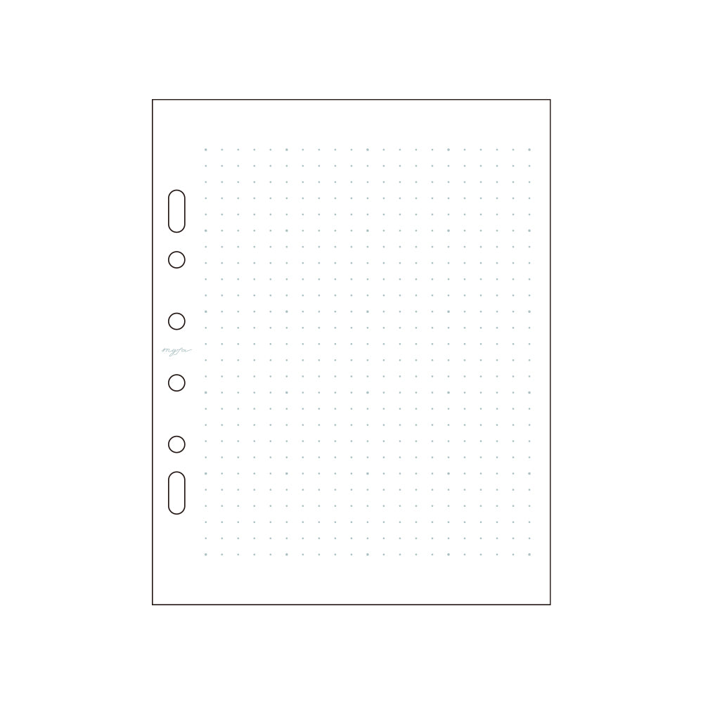 2穴・ミニ6穴に対応した厚口上質紙で書きやすいライフログリフィルです。ドットが目立ちにくい5mmドット方眼リフィルで、罫線にとらわれず自由に使えます。25mm感覚の大きいドットを繋げばマス目が作りやすいです。別売りの罫線ペン(PN-100)で罫線を書き足してアレンジすることができます。コレクションファイル ミニ(F-3320・F-3321)やmyfaシリーズバインダー(N-3320、N-3390、N-3391)などのミニ6穴バインダーに収納可能。